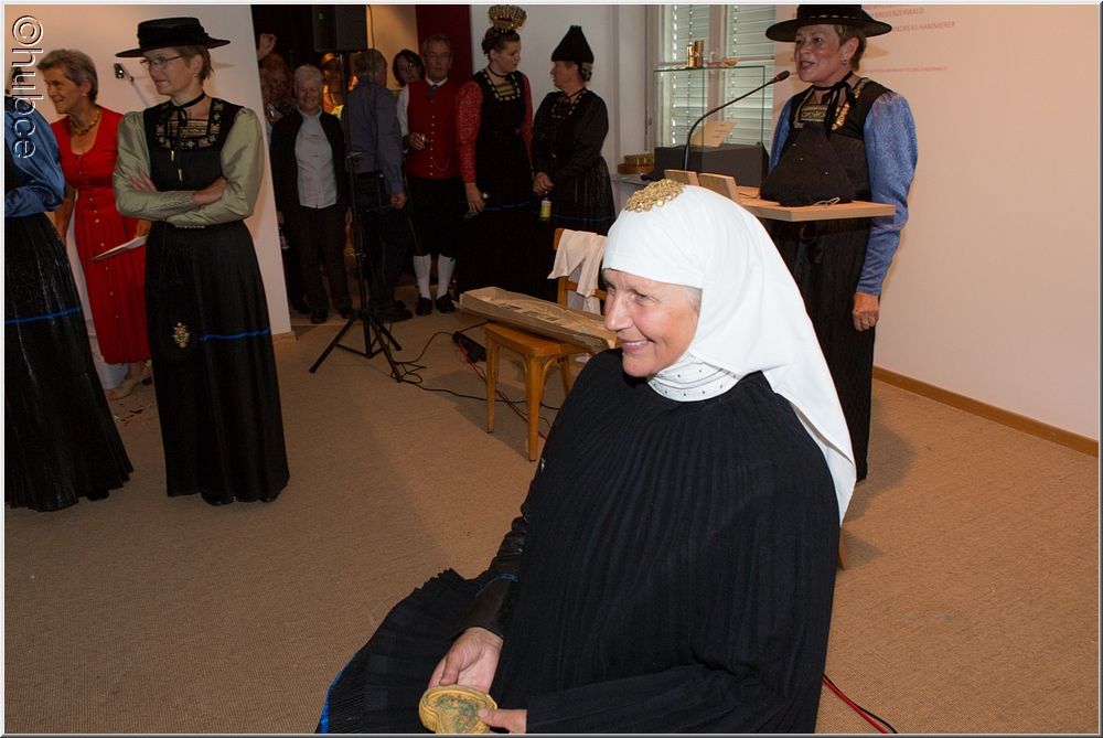 Anschließend wurde zu einem Trachtenfrühschoppen ins Egg Museum eingeladen. Museumsleiter Andreas Hammerer konnte über 220 Besucher begrüßen. Viele Frauen und auch Kinder kamen in der Wäldertracht. Die seit 9. Juni laufende Sommerausstellung „Schätze“ im Egg Museum bot den passenden Rahmen zu der von Barbara Meusburger und Resi Bals vom Verein Intracht gestalteten Vorstellung verschiedener Trachtenteile, die zu kirchlichen Anlässen getragen werden und religiösen Bezug haben.