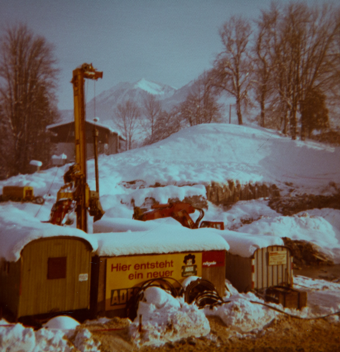 Egg so rund vor vierzig Jahren – GZ-Baustelle im Schnee – im Hintergrund das „Schnidar-Hammerer-Hus. wo heute Scribo Behmann steht. Foto zur Verfügung gestellt von Luis Weidinger