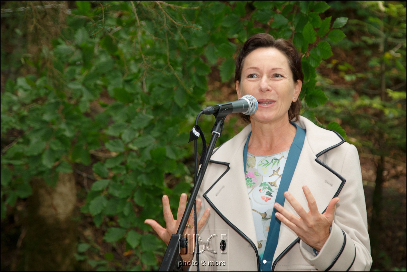 Doris Franz, Musikerin und Lyrikerin aus Andelsbuch ist die Gründerin und Kuratorin des „Maria Erika Lyrikweg“. Da der Wald im Besitz ihrer Familie ist, hat sie den Lyrikweg ihrer Mutter, Maria Erika Mätzler, gewidmet, die demnächst ihren 80. Geburtstag feiert. Die stimmungsvolle Eröffnung im frühherbstlichen Wald wurde nach Grußworten des Andelsbucher Bürgermeisters, Bernhard Kleber und Gesundheitslandesrätin Martina Rüscher sowie der Festrede von Literaturvermittlerin Evelyn Brandt aus Feldkirch vom Chilimangaros Trio musikalisch umrahmt.