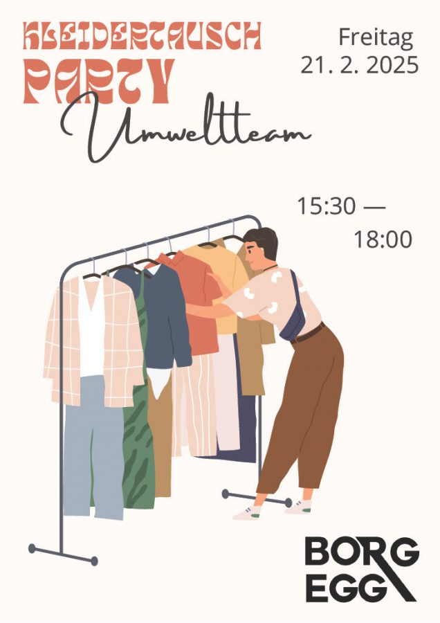 Schüler:innen und Lehrkräfte des BOGG EGG können bereits Montag, Dienstag und Donnerstag in der Mittagspause Kleidung abgeben. Externe können gerne ihre Kleidung am Freitag vorbeibringen und gleichzeitig starten zu tauschen!