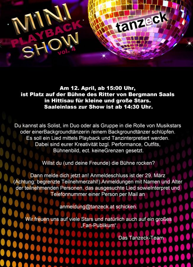 Alle sind willkommen egal ob Tanzeckmitglied oder nicht. Der Eintritt und die Teilnahme ist kostenlos. Es erwarten alle Teilnehmer der Mini-Playbackshow tolle Preise. Mitmachen lohnt sich also!