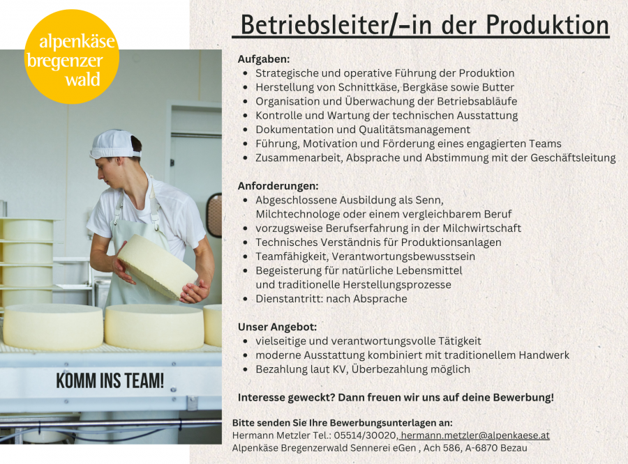 Du liebst hochwertige Lebensmittel, traditionelle Herstellungsverfahren und suchst eine neue Herausforderung mit Verantwortung? Dann bist du bei uns genau richtig! Für unsere moderne Sennerei in Bezau suchen wir eine engagierte Persönlichkeit zur Leitung unserer Produktion. Bewirb dich jetzt und gestalte gemeinsam mit uns die Zukunft der regionalen Käsekunst!