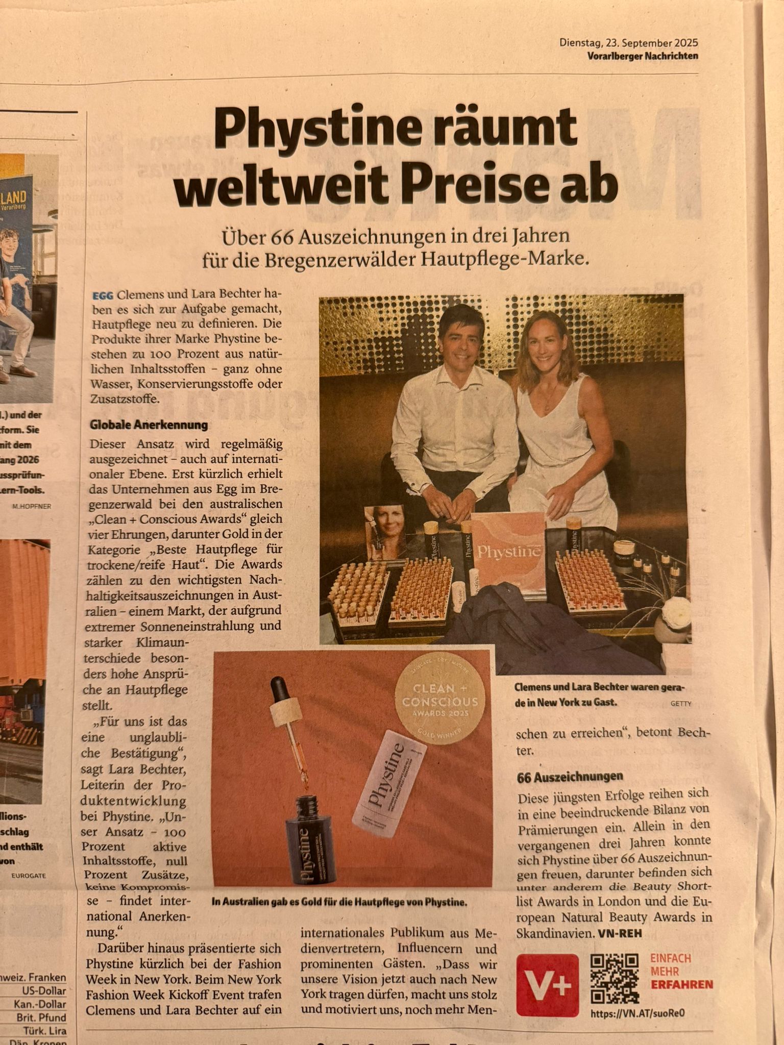 Das Egger Naturkosmetiklabel Phystine sorgt international für Aufsehen: Bei den renommierten Beauty Shortlist Eco Awards gewann es gleich mehrfach – darunter als „Best Waterless Beauty Brand“ und „Eco Brand of the Year“. Insgesamt sammelte Phystine bisher knapp 50 nationale und internationale Auszeichnungen.