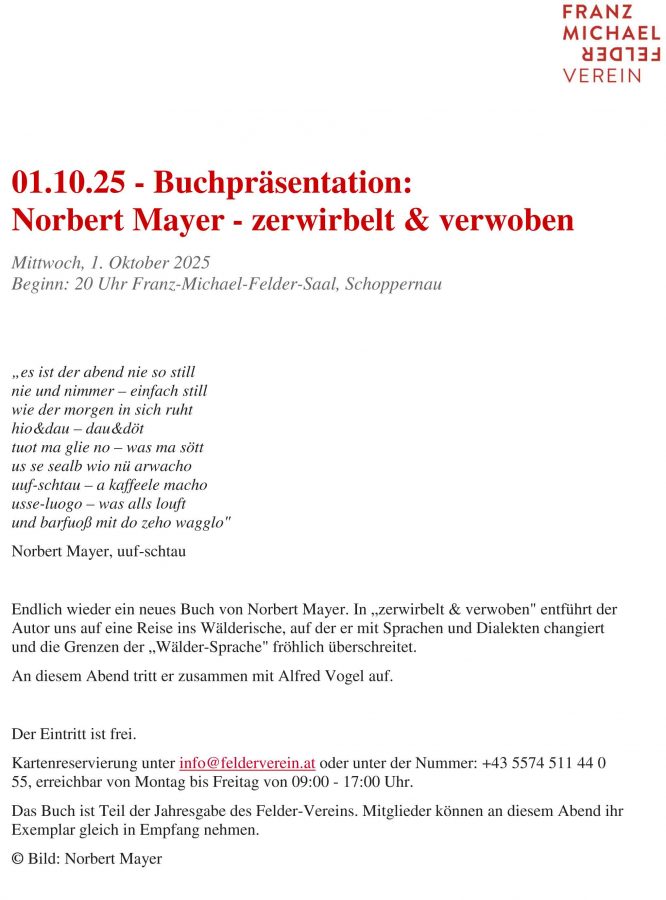 Kartenreservierung unter info@felderverein.at oder unter der Nummer: +43 5574 511 44 0 55, erreichbar von Montag bis Freitag von 09:00 – 17:00 Uhr.