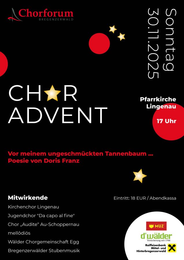 Das Chorforum Bregenzerwald lädt herzlich ein zum Choradvent am 1. Adventssonntag.