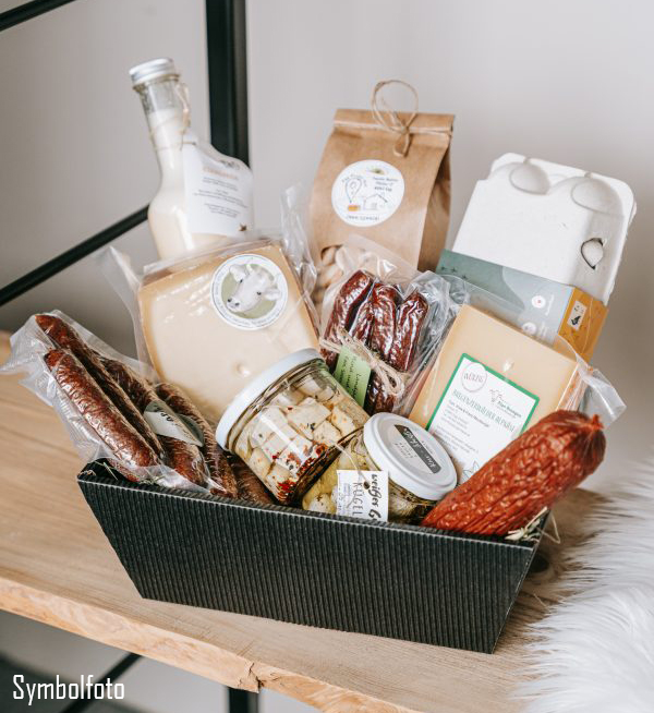 Und fürs regionale Schenken? Wie wäre es mit einem Geschenkskorb, prall gefüllt mit den Lieblingsprodukten unserer Bäuerinnen und Bauern: handgemachte Spezialitäten voller authentischer Vielfalt: Käse, Biodinkel, Nudeln, Kräutersalz, Eier, Kaminwurzen, Butterschmalz, Hüngengold, Sauerkraut dirEGGt vom Bauernhof.