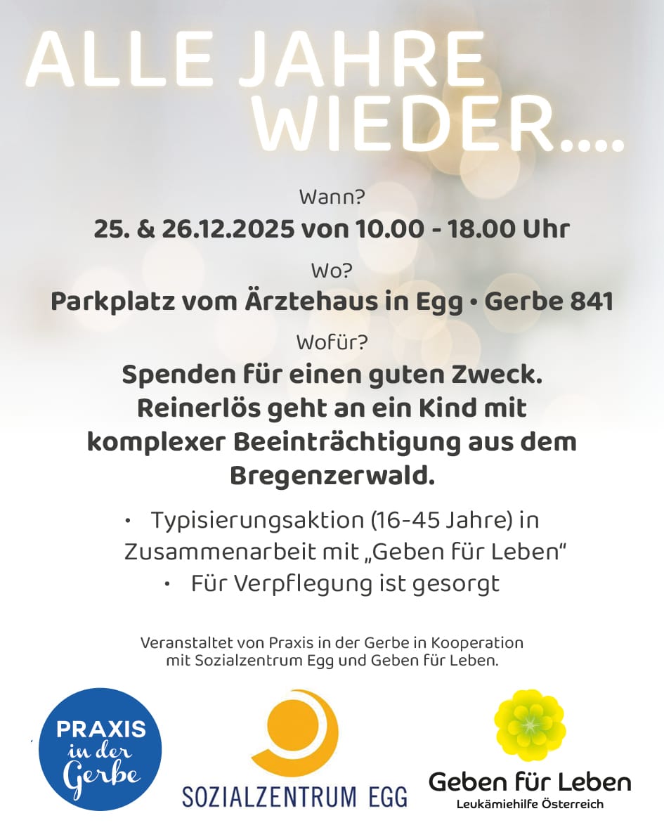 Auch heuer führen wir unseren traditionellen Spendenaufruf fort: Der gesamte Reinerlös kommt einem Kind aus dem Bregenzerwald zugute, das derzeit dringend Unterstützung braucht. Gleichzeitig bieten wir die Möglichkeit, an der Typisierungsaktion „Geben für Leben“ teilzunehmen und damit vielleicht selbst zum Lebensretter zu werden.