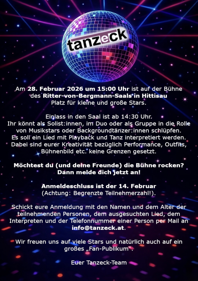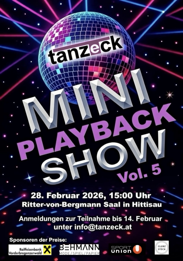 06.01.2026 12:08 von mein Beitrag Tanzeck – Mini-Playback-Show – SA. 28.02 in Hittisau Wir freuen uns auf dein Dabeisein – ob auf der Bühne oder im Publikum! Artikel teilen 169 0 Deine Meinung Name * Kommentar Bild-Upload Bilder auswählen Bilder-Upload