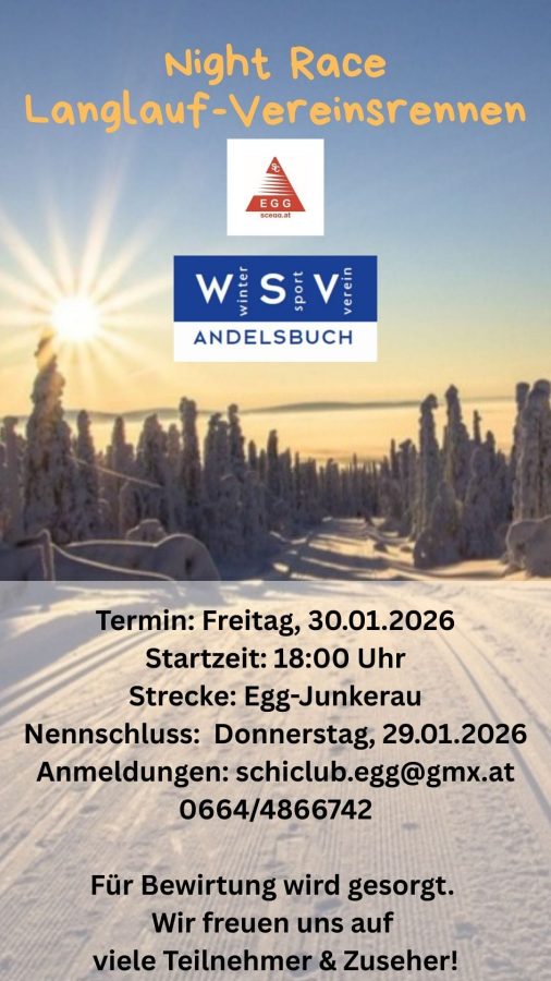 Am Freitag, 30.01.2026, findet in der Junkerau das Langlauf-Vereinsrennen des SC Egg statt. Wie bereits im Vorjahr findet das Rennen bei Flutlicht und gemeinsam mit dem WSV Andelsbuch statt.