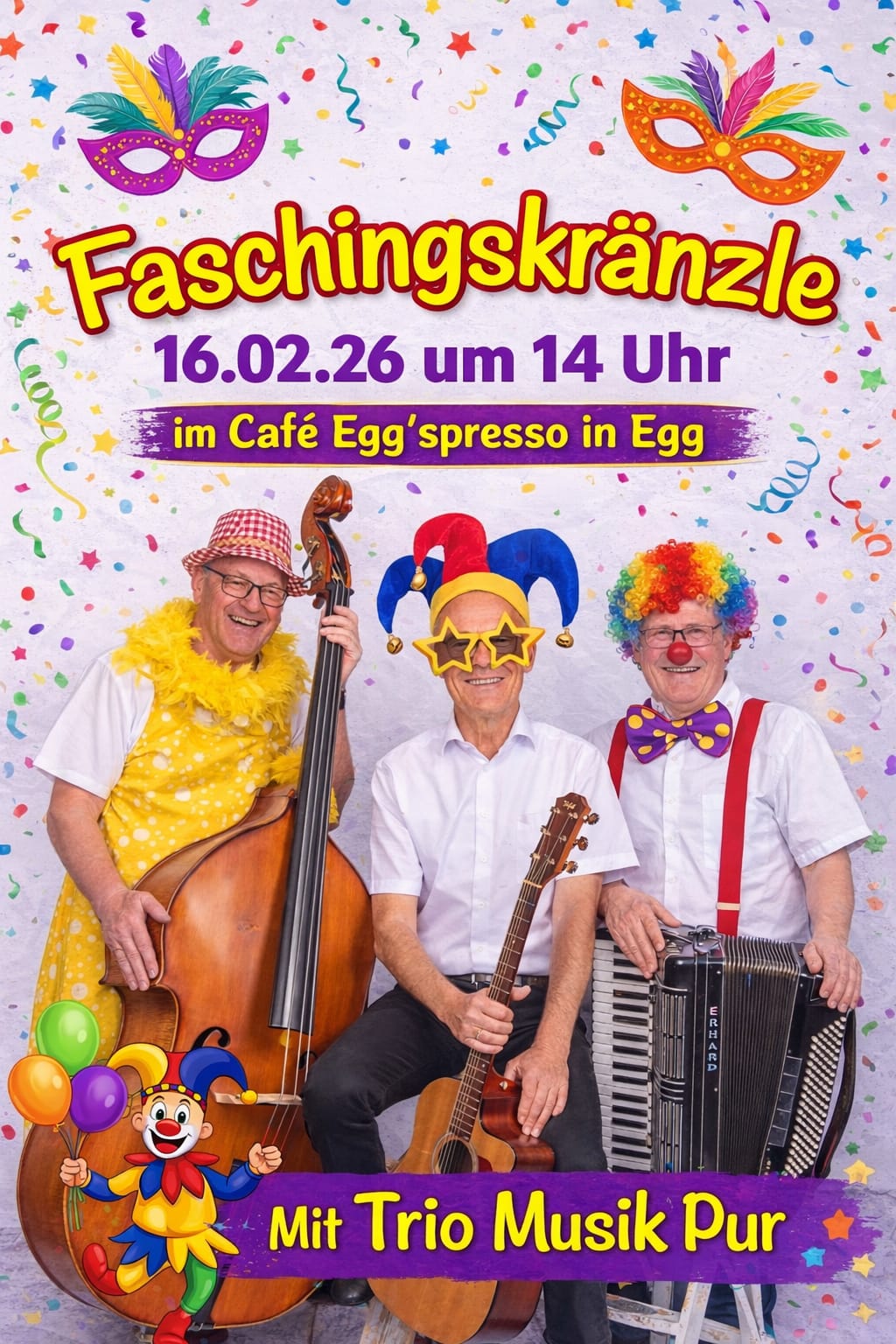 02.02.2026 09:22 von egg-news Café Egg’spresso Faschingskränzle – MO, 16.02 Wir laden herzlich ein am Rosenmontag 🤗 zu Kaffee und Kuchen 🍰 und Musik mit Trio Musik Pur ab 14 Uhr.. Artikel teilen 715 0 Deine Meinung Name * Kommentar Bild-Upload Bilder auswählen Bilder-Upload