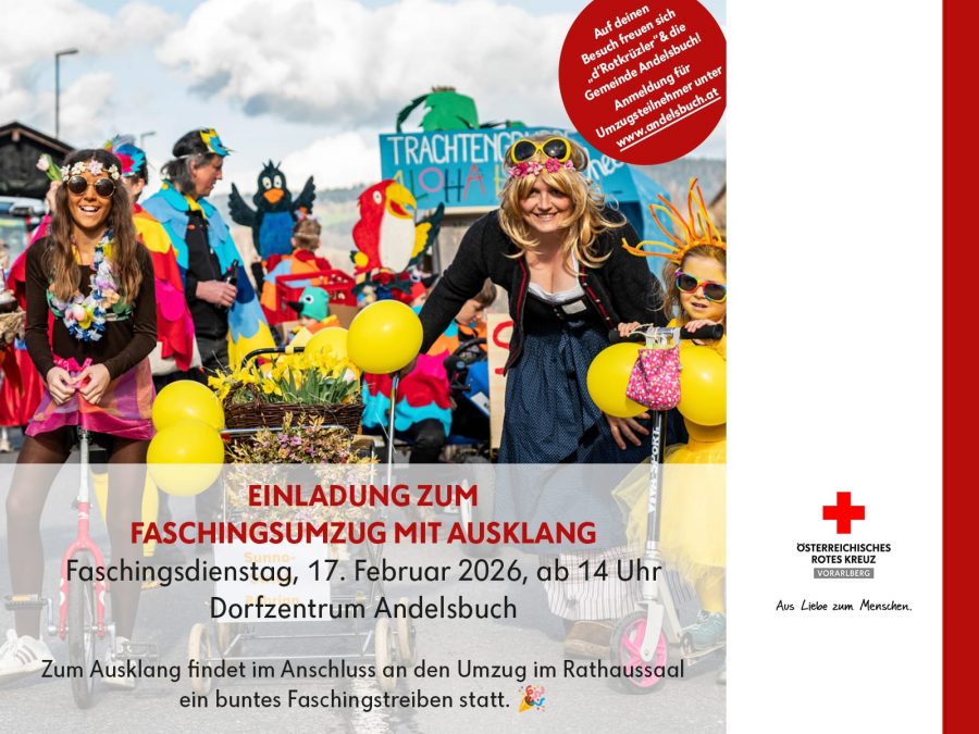 Am Dienstag, 17.02.2026 um 14.00 Uhr laden wir zum traditionellen Faschingsumzug im Zentrum von Andelsbuch ein. Anschließend feiern wir gemeinsam im Rathaussaal weiter und lassen den Fasching ausklingen.