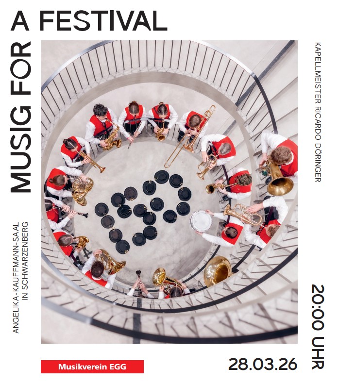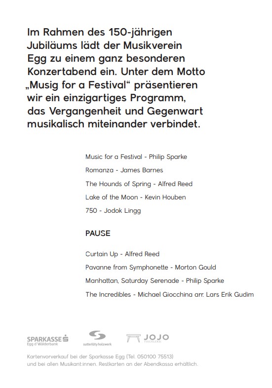 Im Rahmen des 150-jährigen Jubiläums lädt der Musikverein Egg zu einem ganz besonderen Konzertabend ein. Unter dem Motto „Musig for a Festival“ präsentieren wir ein einzigartiges Programm, das Vergangenheit und Gegenwart musikalisch miteinander verbindet.