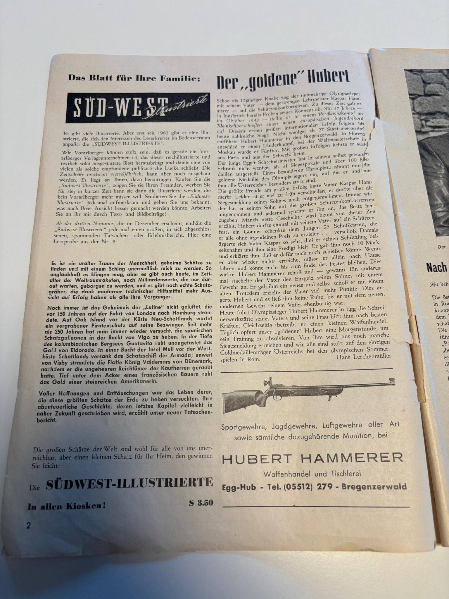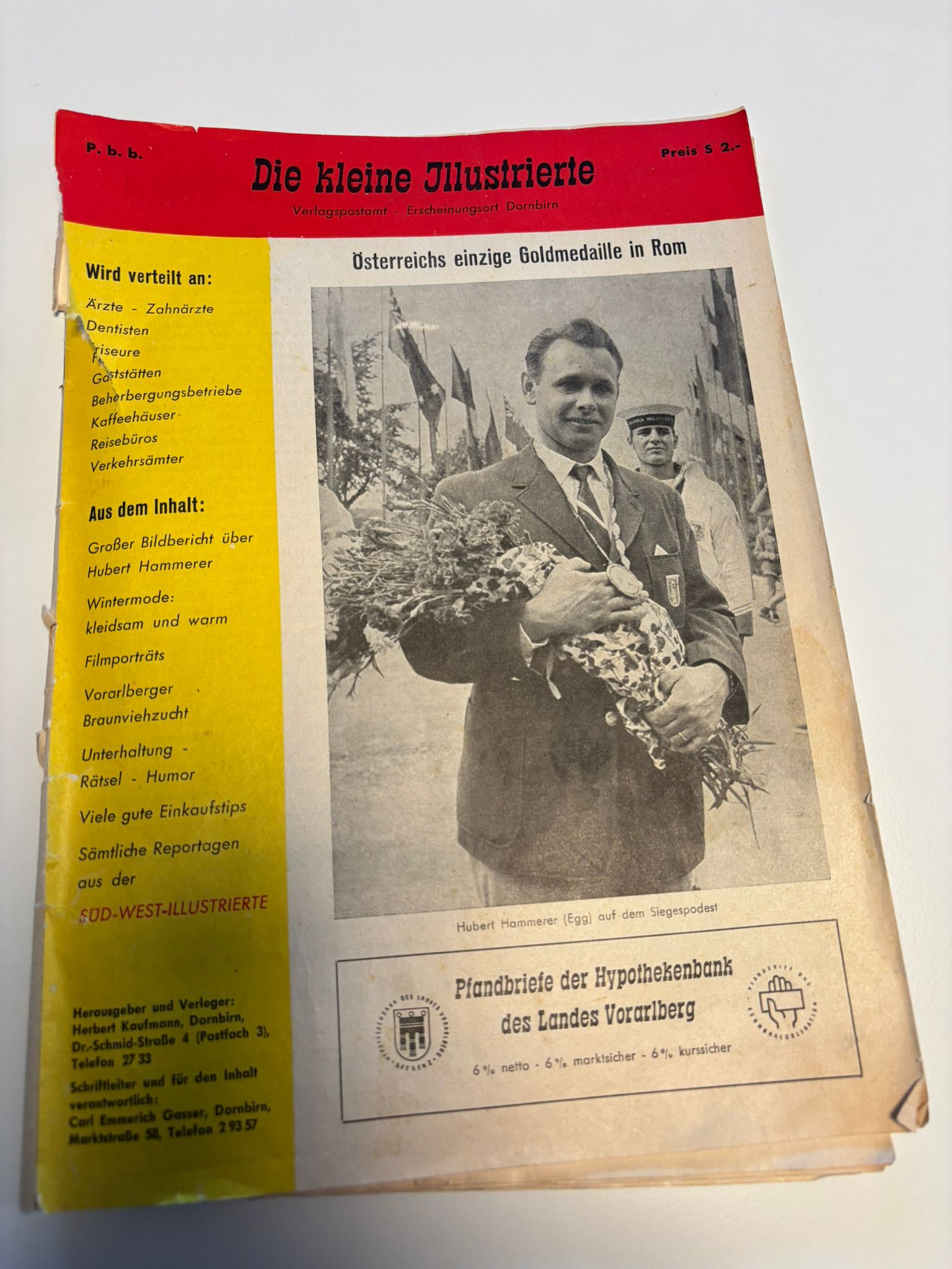 1. Perfekt, 1960 passt wie die Faust aufs Auge! Bei der Zeitung handelte es sich um "Die kleine Illustrierte", Erscheinungsort Dornbirn. Preis: 2,- Schilling. Auf der Titelseite Olympiasieger Hubert Hammerer, mehr dazu etwas später.