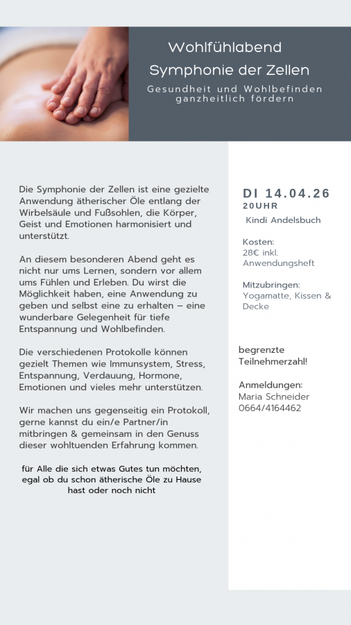 02.04.2026 07:08 von mein Beitrag Wohlfühlabend für dich – DI, 14.04 Ich lade dich herzlich ein zum Wohlfühlabend mit einer Anwendung mit ätherischen Ölen für deine Gesundheit. 14.04.2026 um 20 Uhr im Kindi Andelsbuch Alle Infos und Anmeldung findest du im Anhang. Artikel teilen 69 0 Deine Meinung Name * Kommentar Bild-Upload Bilder auswählen Bilder-Upload