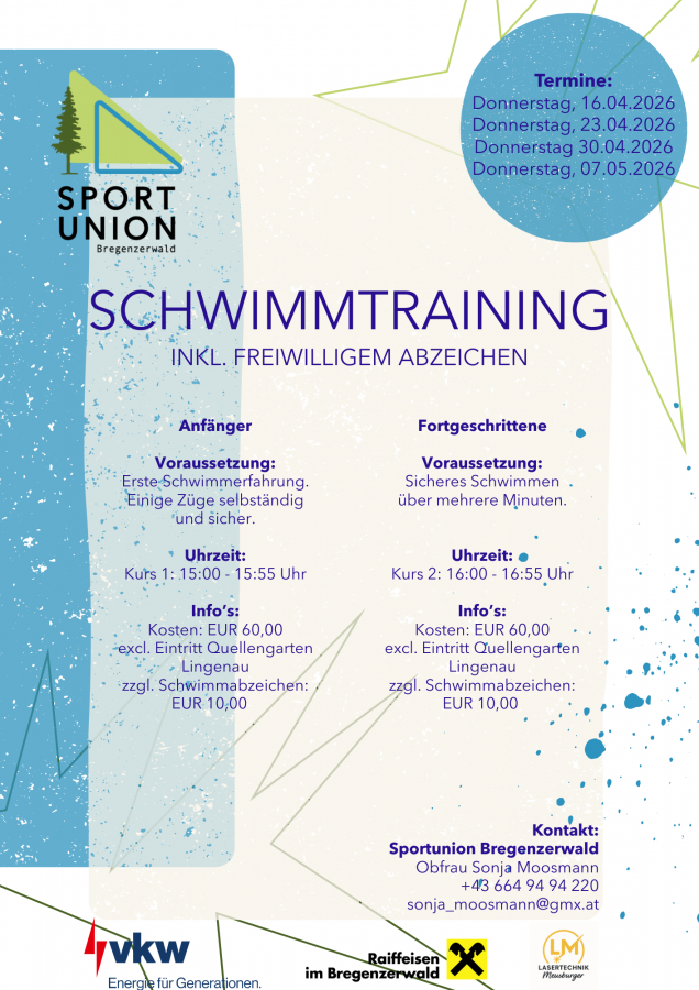 Gemeinsam arbeiten wir an deiner Technik und verbessern deine Ausdauer im Wasser. Beim letzten Termin bekommen wir außerdem Besuch von der Wasserrettung Bregenzerwald. Freiwillige Teilnehmer:innen haben dabei die Möglichkeit, – bei Erfüllung der jeweiligen Anforderungen – ein offizielles Schwimmabzeichen zu machen.