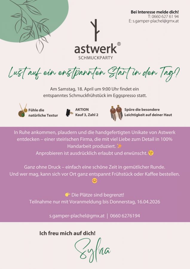 Am Samstag, 18. April um 9:00 Uhr findet ein entspanntes Schmuckfrühstück im Eggspresso statt.