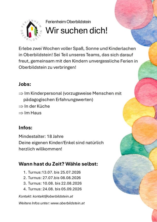 Erlebe zwei Wochen voller Spaß, Sonne und Kinderlachen in Oberbildstein! Sei Teilunseres Teams, das sich darauf freut, gemeinsam mit den Kindern unvergessliche Ferien in Oberbildstein zu verbringen!
