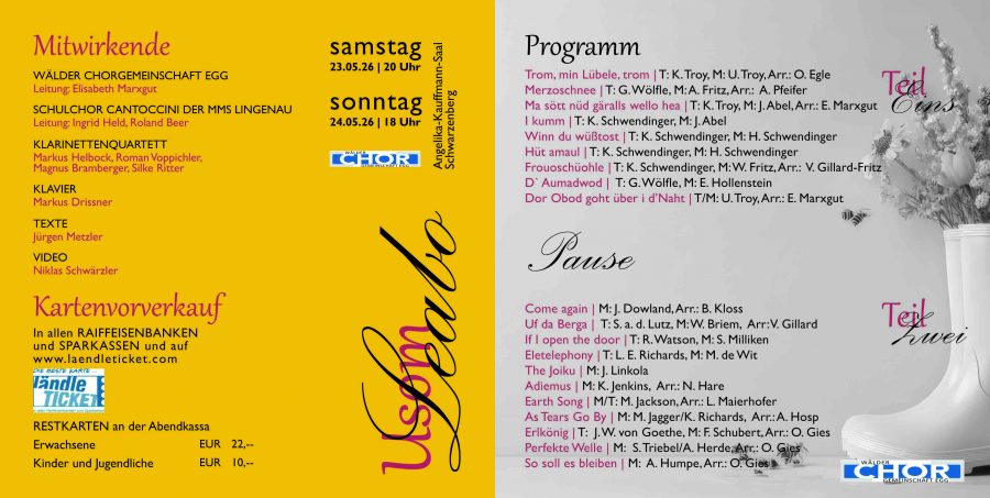 Mit ihrem diesjährigen Konzertprogramm „usom Leaba“ widmet sich die Wälder Chorgemeinschaft Egg den Höhen und Tiefen des Lebens. Die Auswahl an Liedern spannt einen weiten Bogen – von „Trom min Lübele“ bis hin zu „Dor Obod goht über i d´Naht“. Entsprechende Texte, ausgesucht und gesprochen von Jürgen Metzler, begleiten diesen Teil.