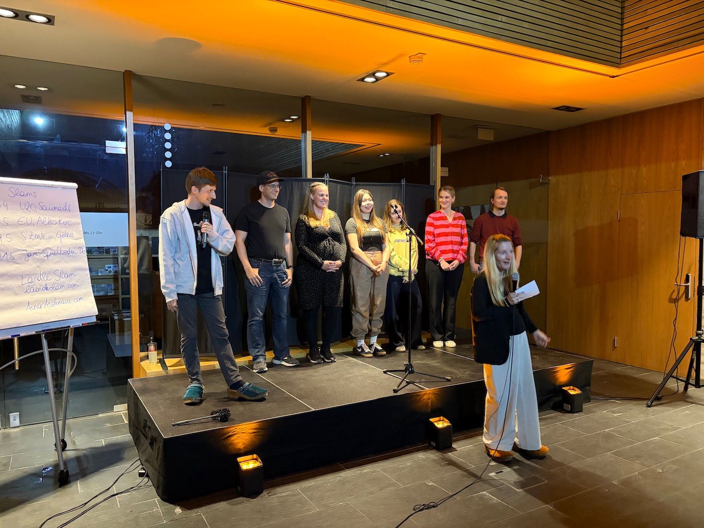 Der Redewettbewerb, bei dem in 6 Minuten selbstverfasste Texte frei vorgetragen werden müssen, wurde vom Ländle Slam organisiert und von der dorfkultur im Impulszentrum Egg abgehalten.