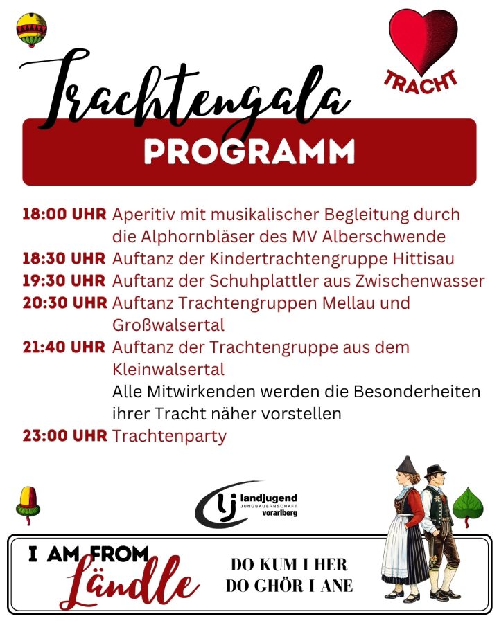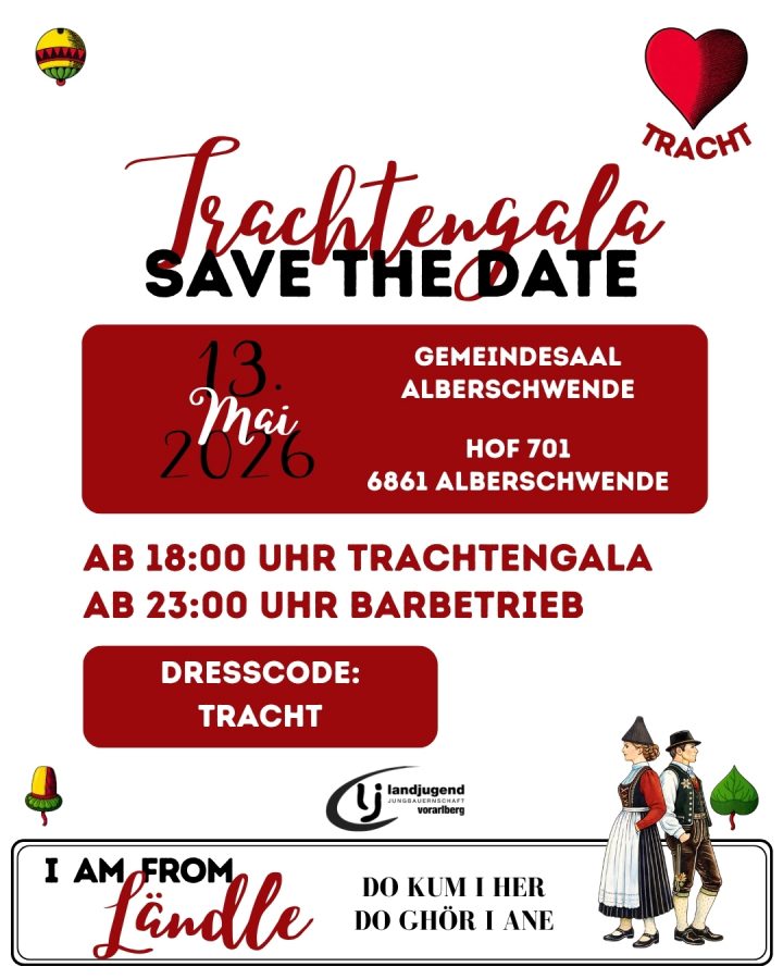 Die Landjugend Jungbauernschaft Vorarlberg lädt am 13. Mai 2026 im Dorfsaal Alberschwende zur feierlichen Trachtengala ein. Dies ist ein Höhepunkt des Jahresschwerpunktthemas „I am from Ländle – Do kum i her do ghör i ane“, bei welchem Brauchtum und Tradition wieder in den Mittelpunkt gerückt werden sollen.
