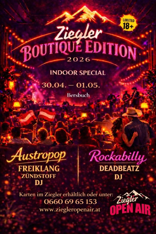 26.04.2026 21:10 von mein Beitrag Ziegler Openair 2026 – DO, 30.04 / Austropop & Rockabilly Am 30. April feiern wir gemeinsam die Ziegler Boutique Edition – diesmal indoor – mit jeder Menge Austropop-Feeling, Emotionen & Party-Stimmung! 🇦🇹 Artikel teilen 54 0 Deine Meinung Name * Kommentar Bild-Upload Bilder auswählen Bilder-Upload